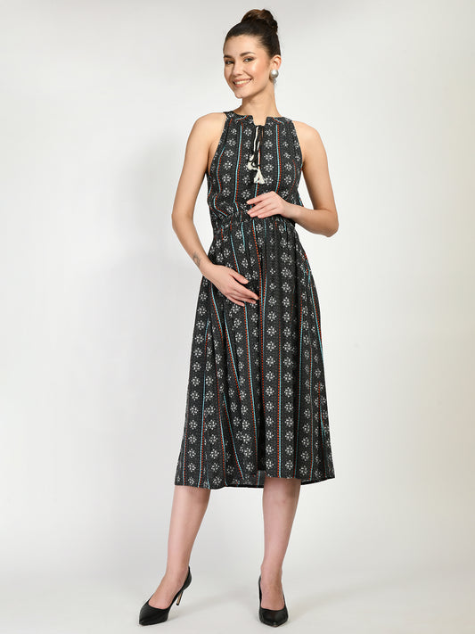 Black Ethnic Motifs Tie-Up Neck Maternity Midi Dress