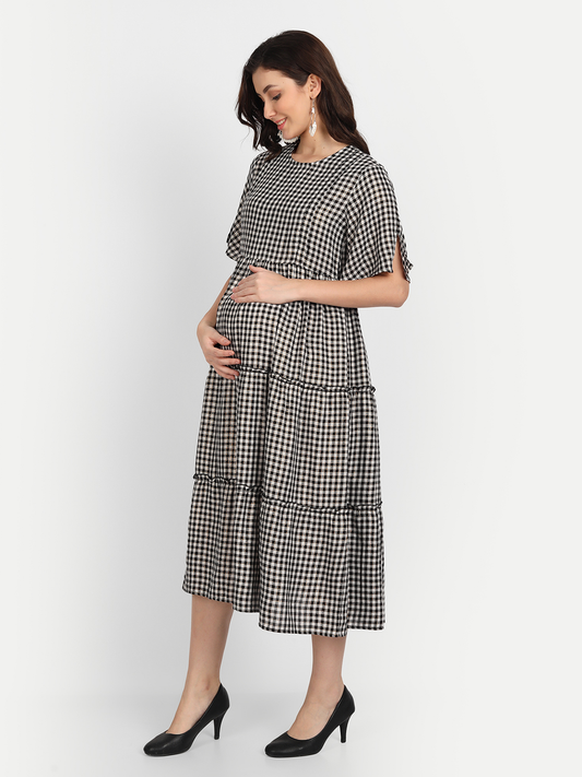 Black Checked A-Line Maternity Midi Dress