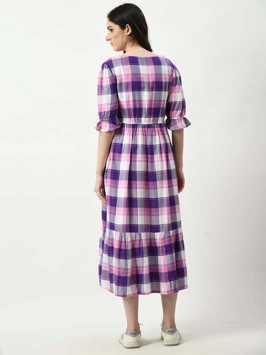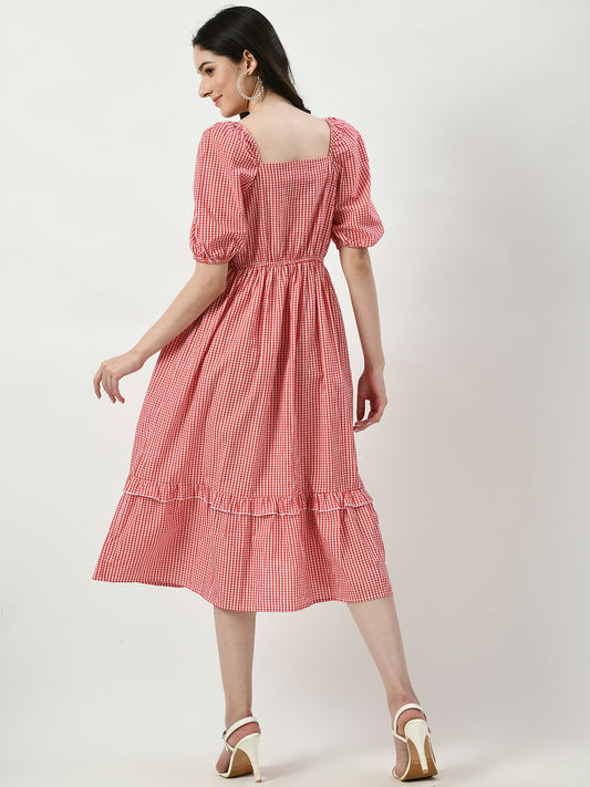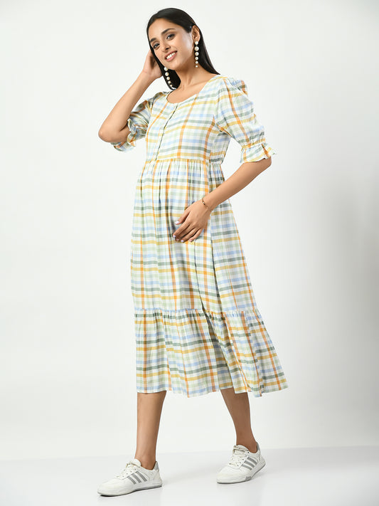 Checked Square Neck Puff Sleeves Maternity Fit & Flare Midi Dress