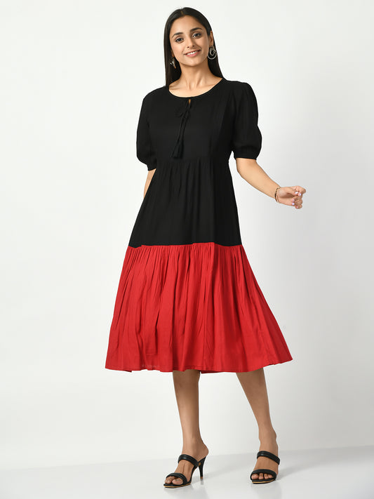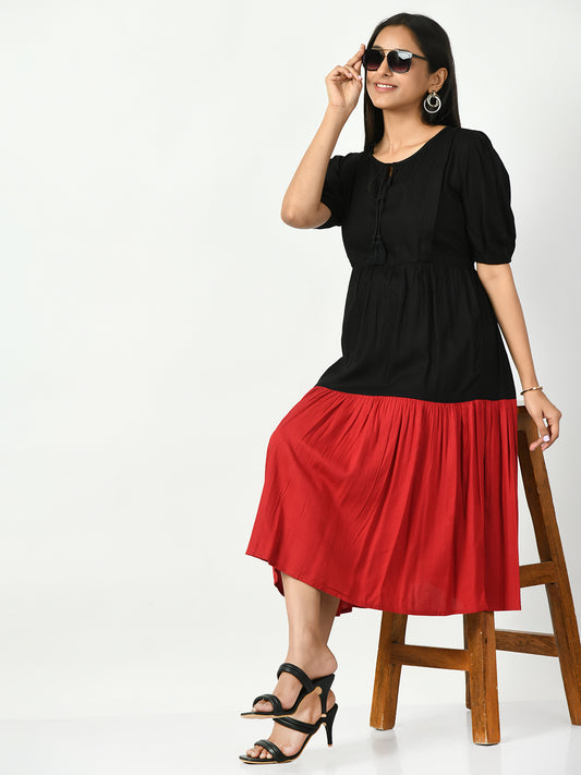 Colourblocked Puff Sleeve Fit & Flare Maternity Midi Dress