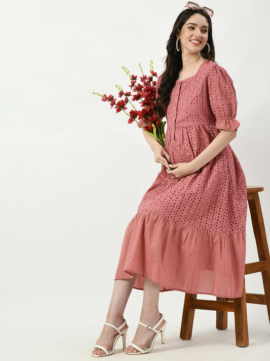 Self Design Gathered Tiered Maternity Cotton Fit & Flare Midi Dress