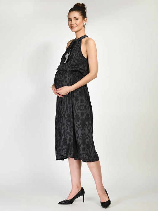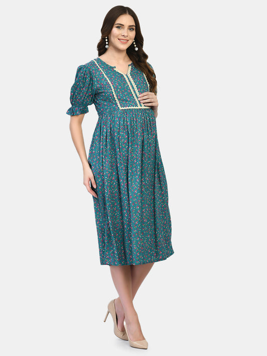 Tie-Up Neck Floral Printed Midi Fit And Flare Maternity Dress
