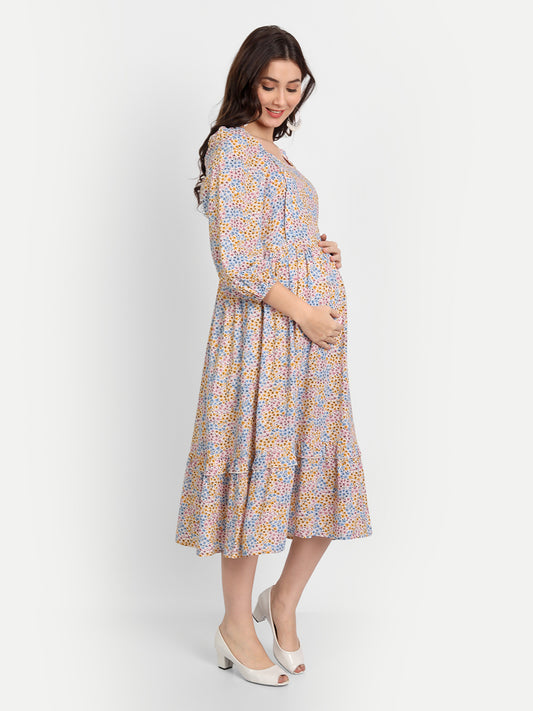 Floral Print Flared Sleeve Fit & Flare Maternity Midi Dress