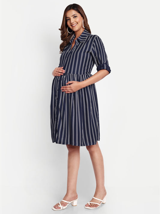 Women Navy Blue Shirt Collar Maternity Fit and Flare