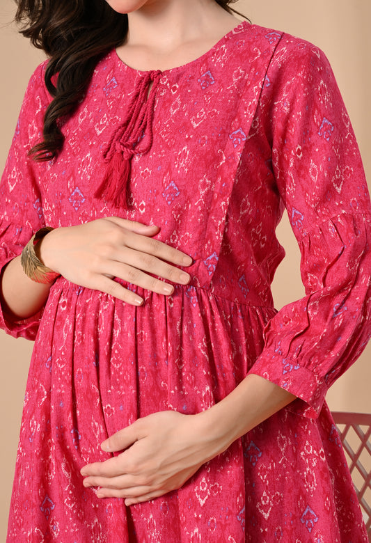 Ethnic Motifs Print Tie-Up Neck Bell Sleeve Maternity Fit & Flare Midi Dress