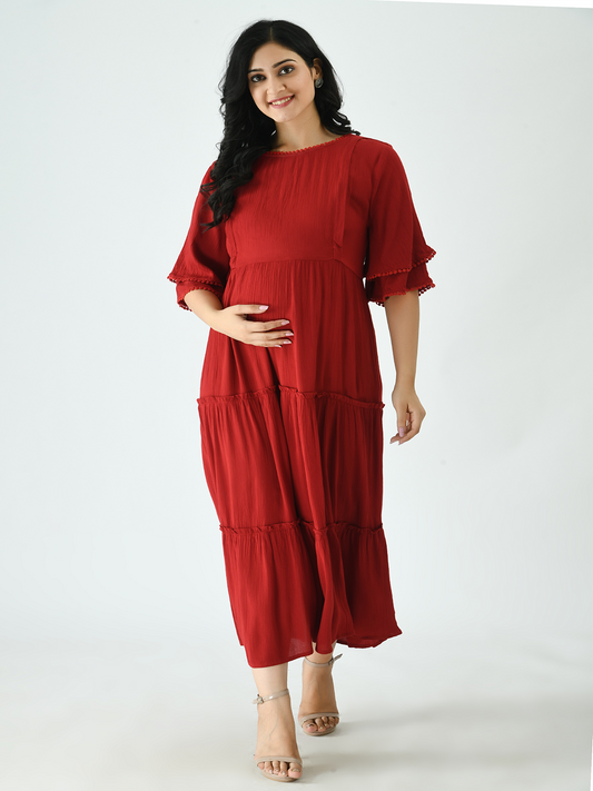 Aaruvi Ruchi Verma Women Red Maternity Tiered Maxi Dress
