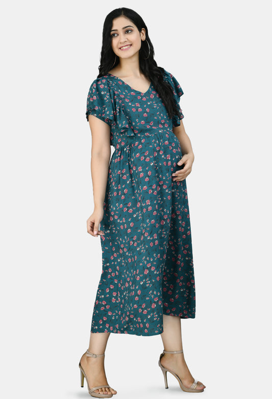 Sea Green Ethnic Motifs A-Line Maternity Midi Dress