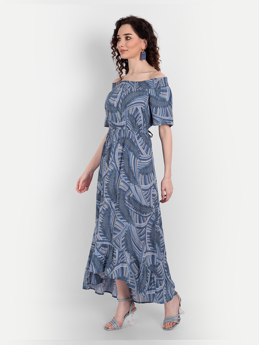 Blue Ethnic Motifs Off-Shoulder Maxi Dress