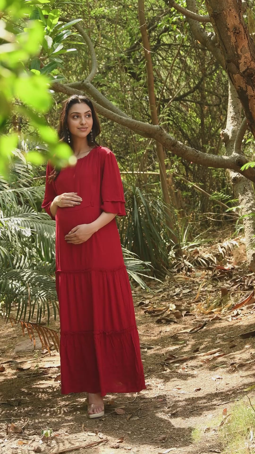 Aaruvi Ruchi Verma Women Red Maternity Tiered Maxi Dress