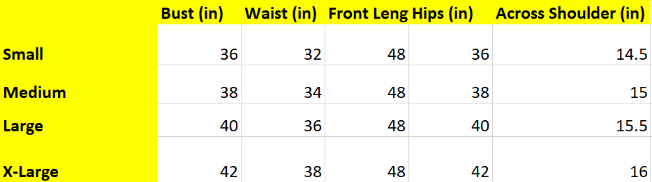 | Bust(in) | Waist (in) | Front Leg (in) | Hips (in) | Across Shoulder(in) | |