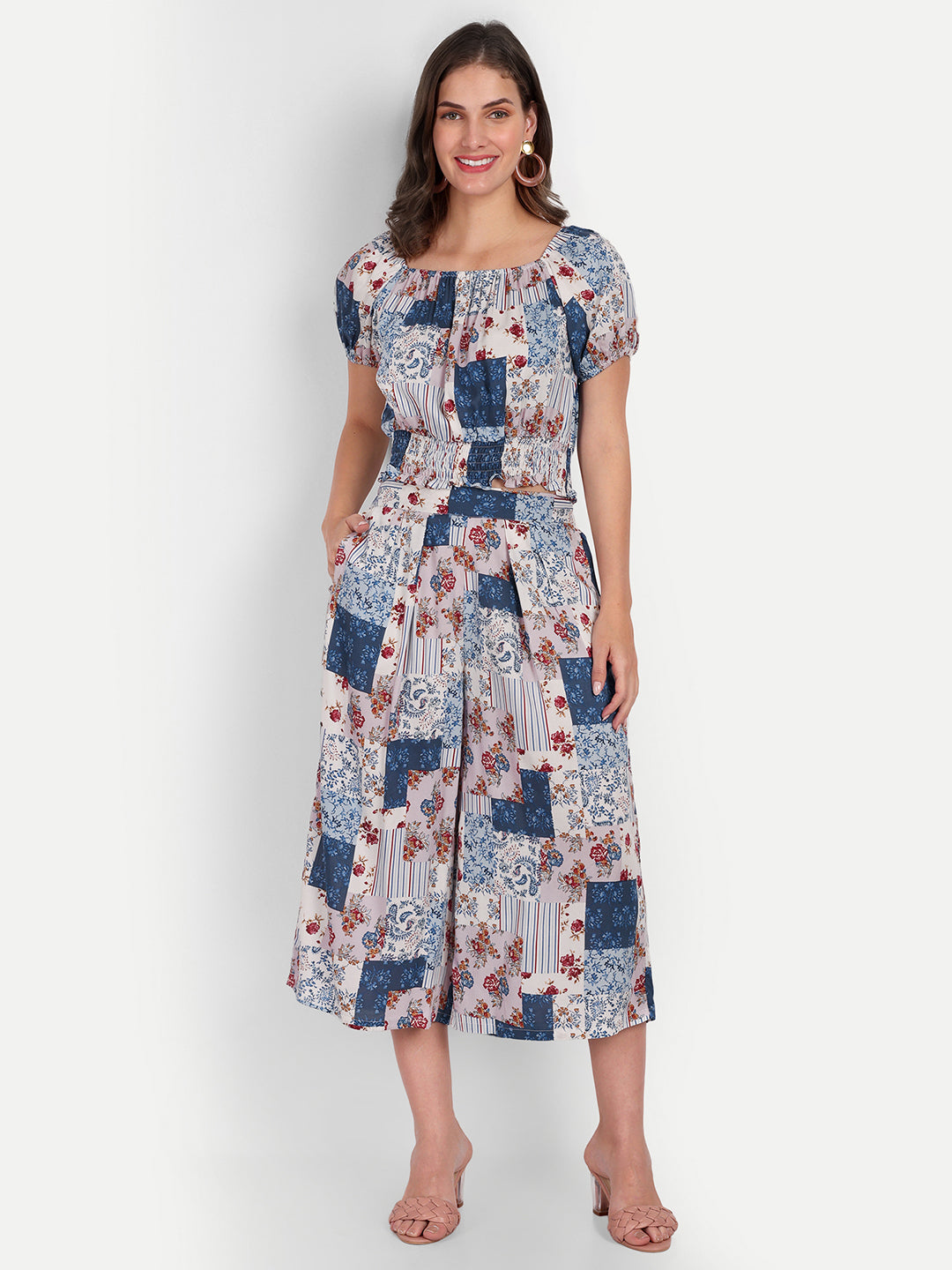 White, blue and red printed palazzos has a partially elasticated waistband with a slip-on closure