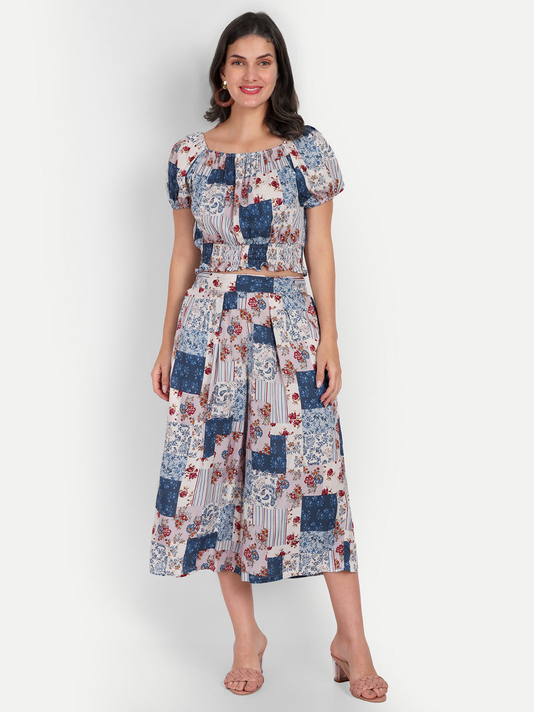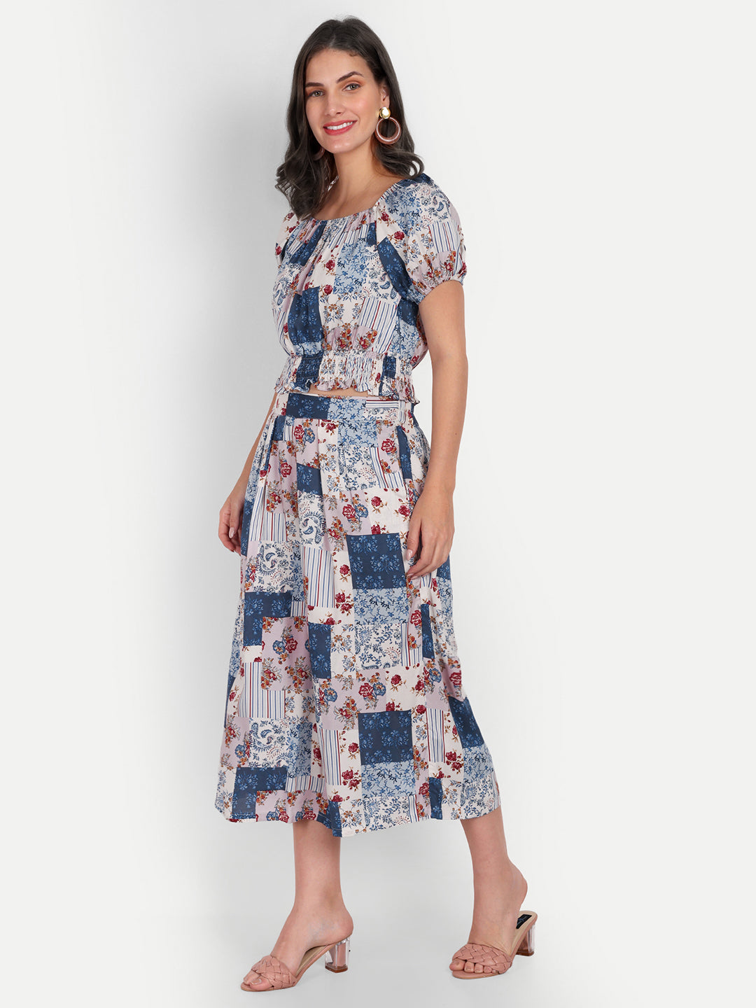White, blue and red printed crop top has a square neck, short sleeves and elasticated hem