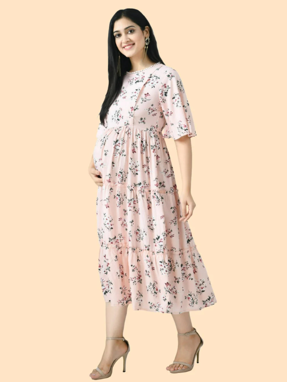 Peach-Coloured Floral Printed Maternity Midi Dress